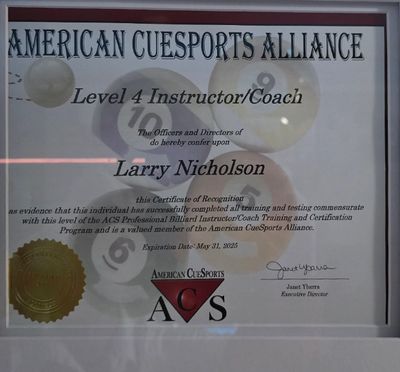 The aim of the American CueSports Association (ACS) is to train and certify well- qualified Instructors/Coaches to serve the Billiard public. Level IV instructors have achieved the highest-level certification offered by the ACS. https://americancuesports.org