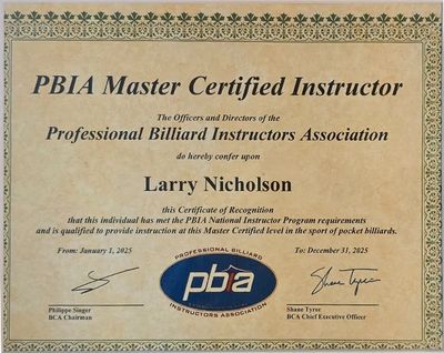The PBIA is the largest international organization of professional billiard instructors. Master Instructors have achieved the highest-level certification offered by the PBIA. https://playbetterbilliards.com
